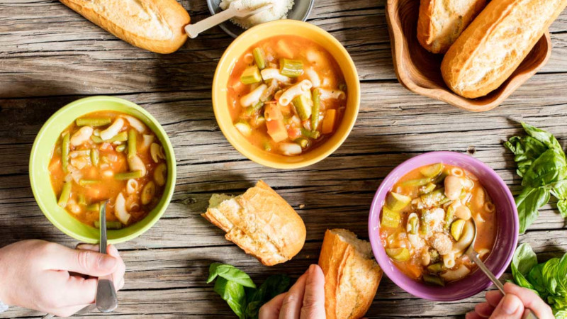 Packed full of vegetables and pasta, this Italian soup is a meal all on its own. Minestrone can be made with any seasonal vegetables you have on hand, and because it’s eaten much like a stew, you can be generous with both the pasta and the vegetables you add.