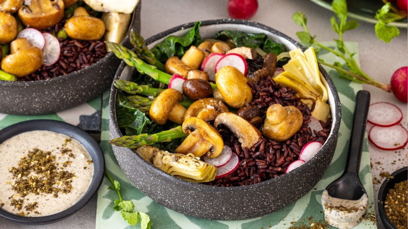 Mushroom, Kale & Black Rice Bowls with Za’atar Tahini Sauce
