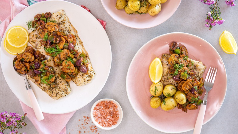 - Â Serve the baked fish topped with a generous amount of mushroom caponata, fresh dill and some steamed baby potatoes.