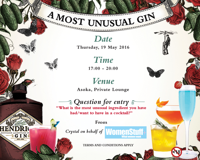 We’ve got 5 spots for WomenStuff readers at the event and all you need to do to stand a chance to win a spot at the tasting is tell us what the most unusual ingredient you have had or want to have in a cocktail. Email your answer along with your name, contact details, and the subject line: “Hendrick’s Entry” to crystal@menstuff.co.za (one email entry per person please). Competition closes on Wednesday 18 May at 11:00.